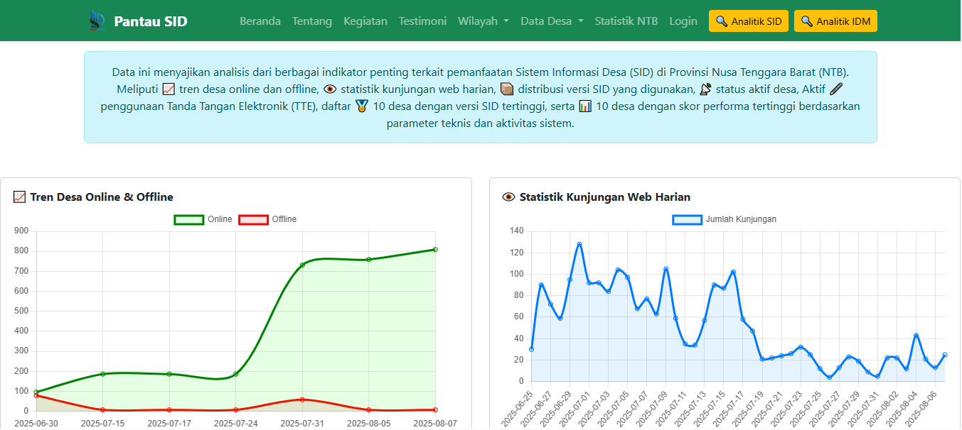 Pantau SID NTB | Agustus 2025 รขโฌโ Digitalisasi desa di Provinsi Nusa Tenggara Barat (NTB) terus menunjukkan progres yang menggembirakan. Sistem Informasi Desa (SID) yang diterapkan melalui platform OpenSID kini telah menjadi elemen penting dalam tata kelola pemerintahan desa. Untuk melihat sejauh mana pemanfaatan sistem ini berkembang, Pantau SID NTB melakukan analisis dan benchmarking terhadap berbagai indikator utama, mulai dari keaktifan desa, pembaruan versi, statistik kunjungan web, hingga performa teknis masing-masing desa.